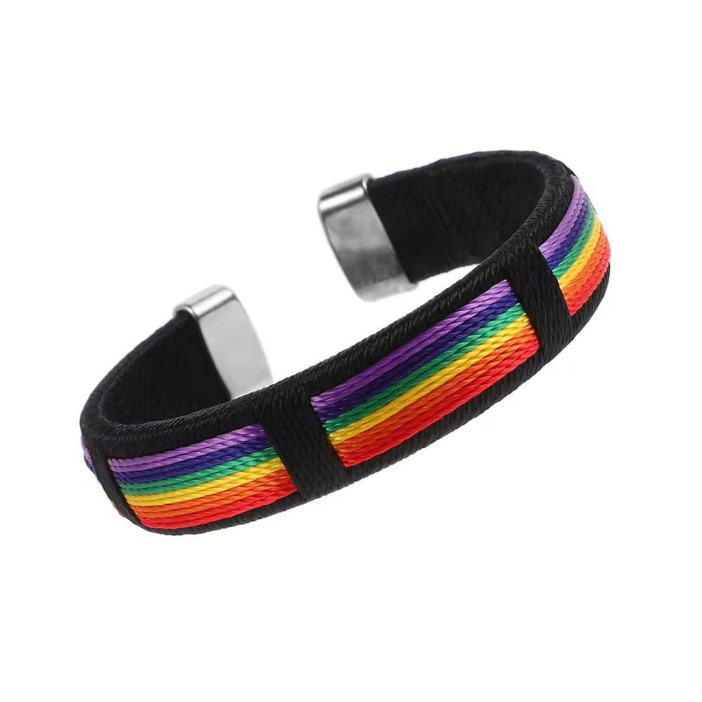 Bracelet noir en tissu avec les couleurs arc en ciel sur le dessus pour porter fièrement nos couleurs !